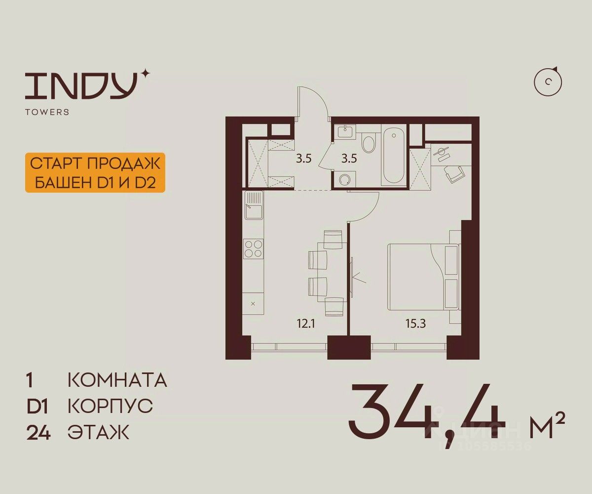 Продается уютная однокомнатная квартира на 24 этаже жилого комплекса Indy Towers. Срок сдачи: 3 кв. 2029 г.