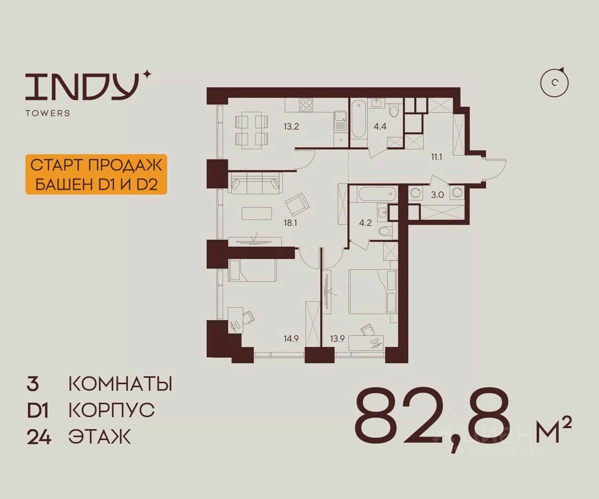 Продается просторная 3-комнатная квартира на 24 этаже жилого комплекса Indy Towers. Срок сдачи: 3 кв. 2029 г.