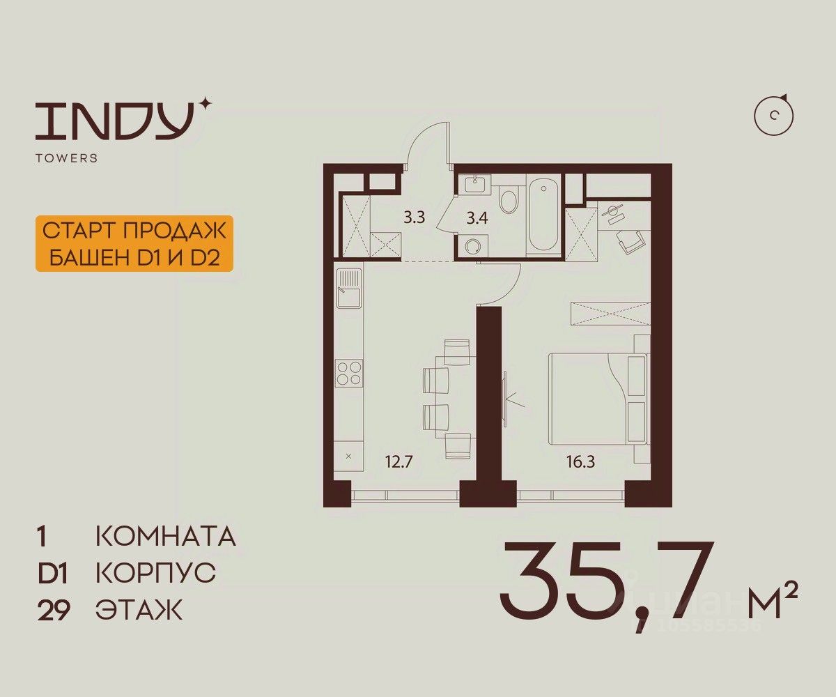 Продается уютная однокомнатная квартира на 29 этаже жилого комплекса Indy Towers. Срок сдачи: 3 кв. 2029 г.