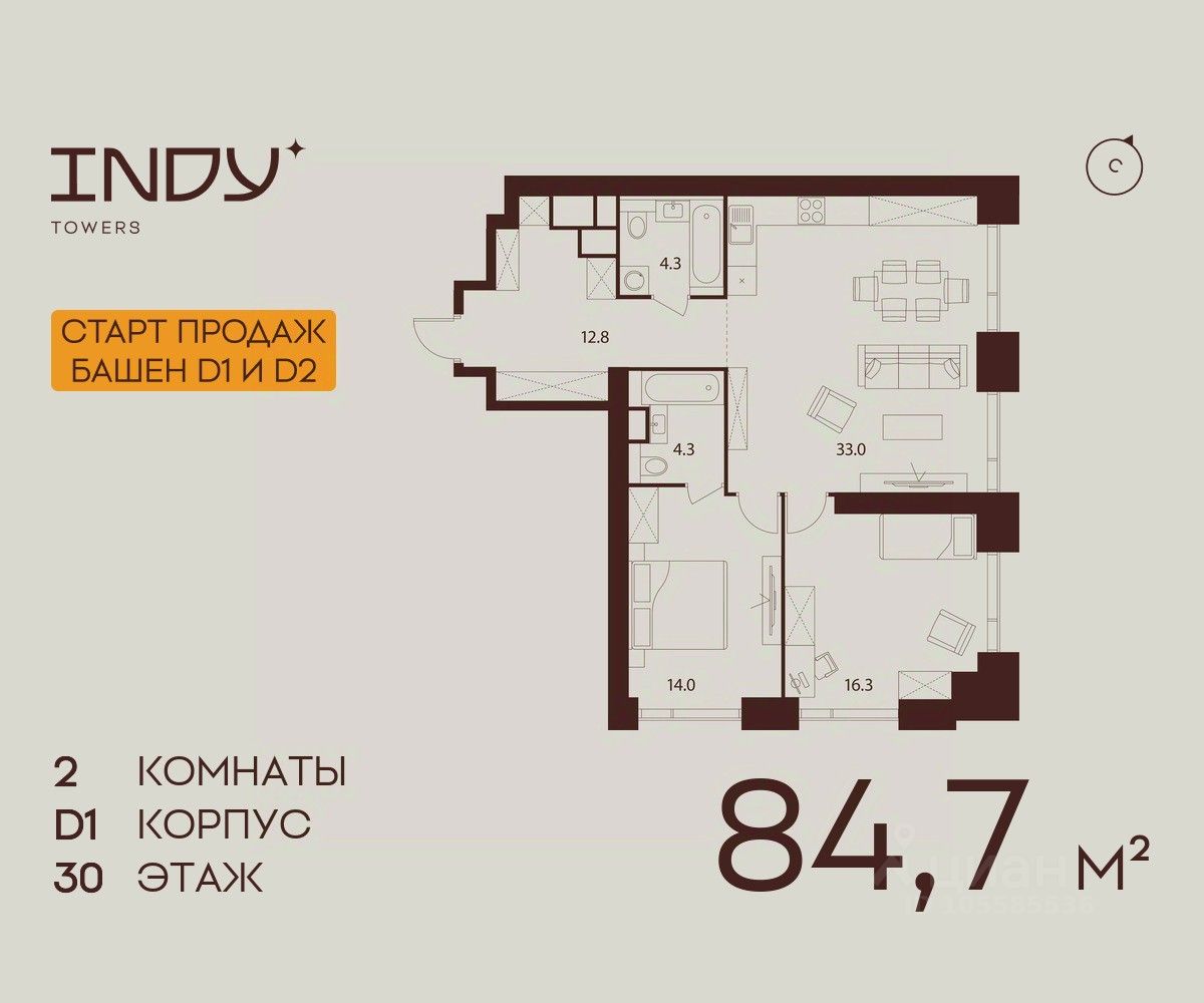 Продается просторная 2-комнатная квартира на 30 этаже жилого комплекса Indy Towers. Срок сдачи: 3 кв. 2029 г.