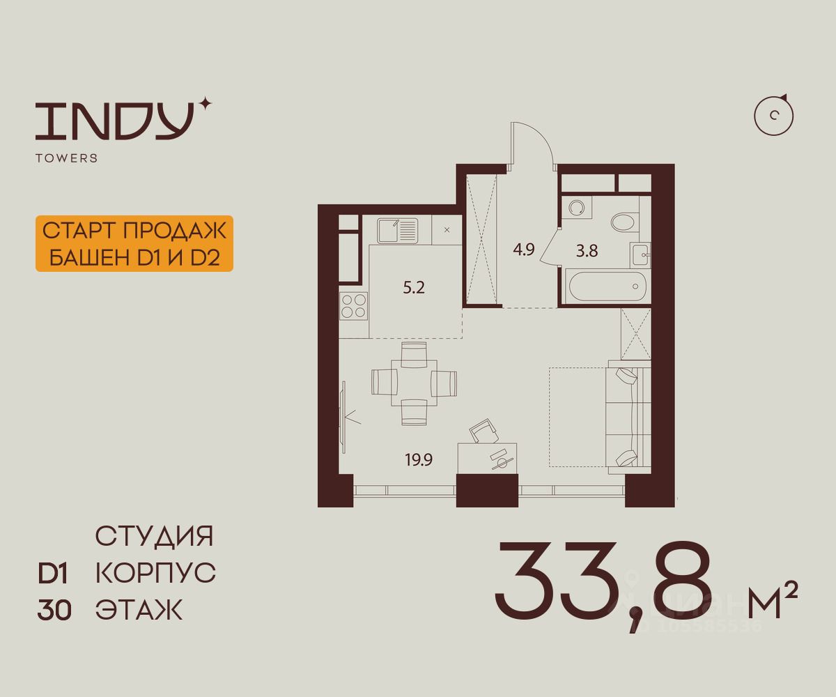 Продается просторная студия на 30 этаже жилого комплекса Indy Towers. Срок сдачи: 3 кв. 2029 г.