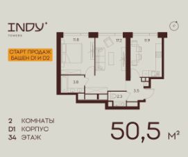 Продается 2-комнатная квартира на 34 этаже жилого комплекса Indy Towers. Срок сдачи: 3 кв. 2029 г.