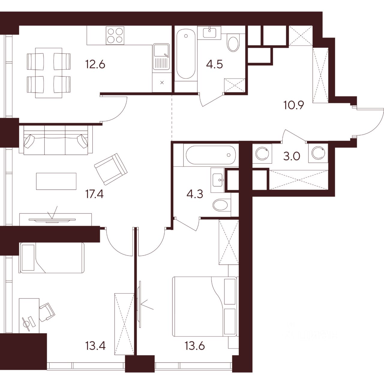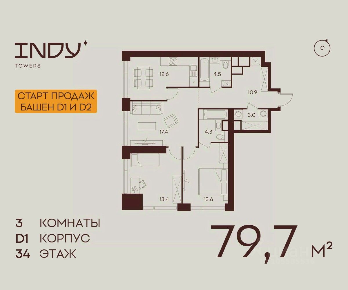 Продается просторная 3-комнатная квартира на 34 этаже жилого комплекса Indy Towers. Срок сдачи: 3 кв. 2029 г.
