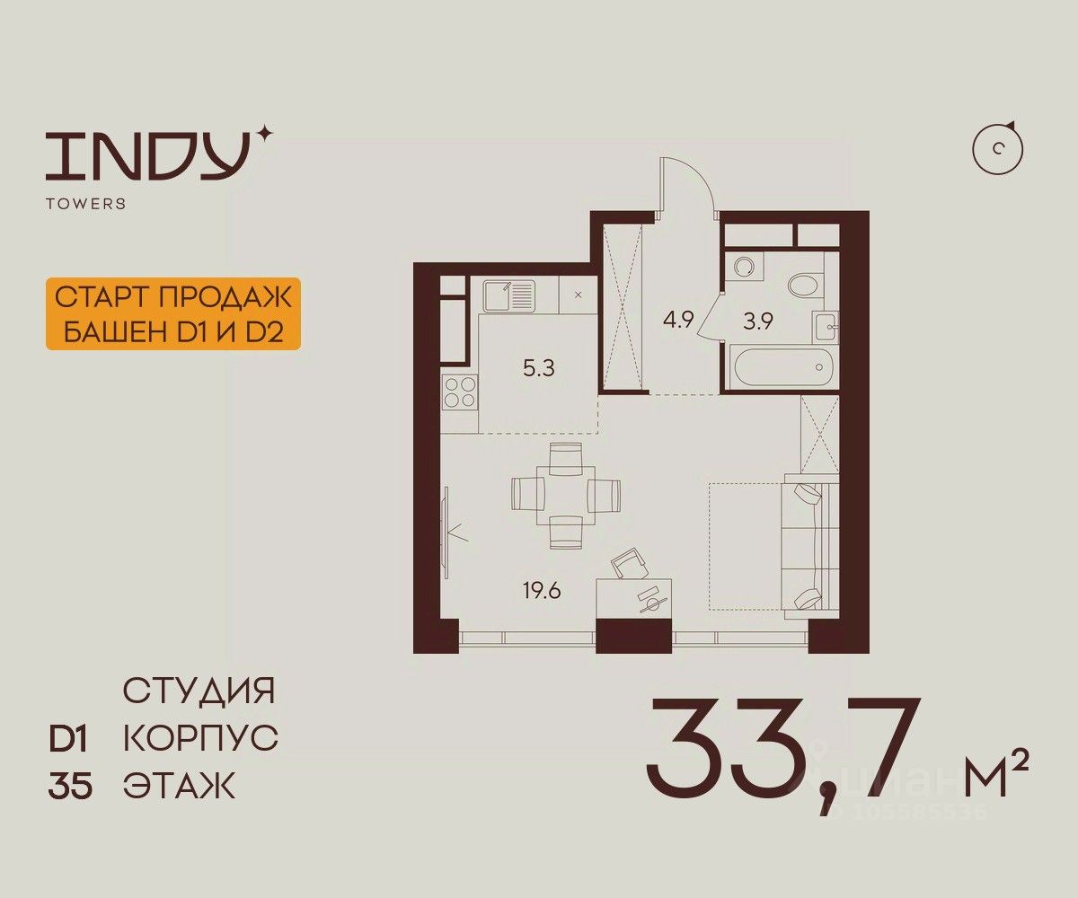 Продается просторная студия на 35 этаже жилого комплекса Indy Towers. Срок сдачи: 3 кв. 2029 г.