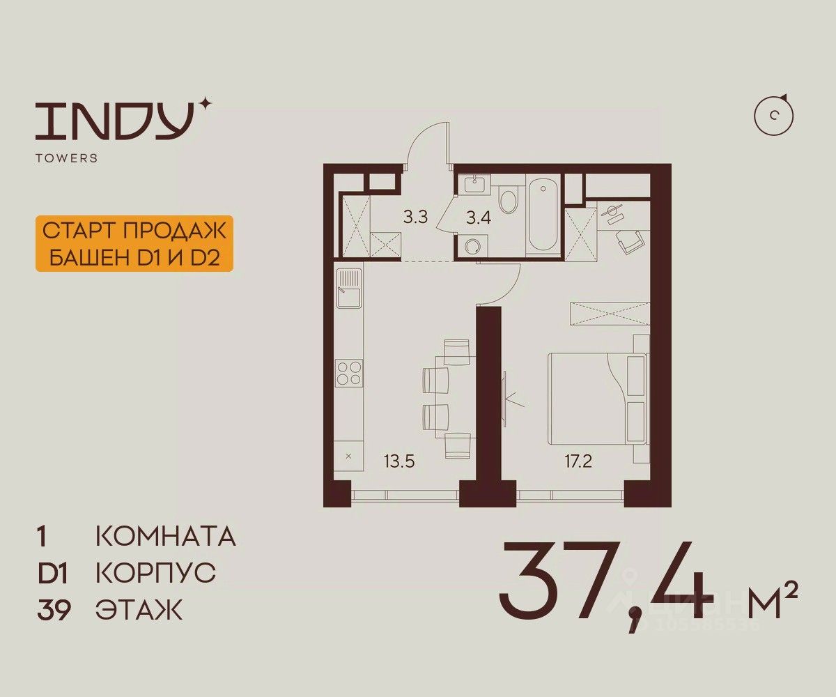 Продается уютная однокомнатная квартира на 39 этаже жилого комплекса Indy Towers. Срок сдачи: 3 кв. 2029 г.