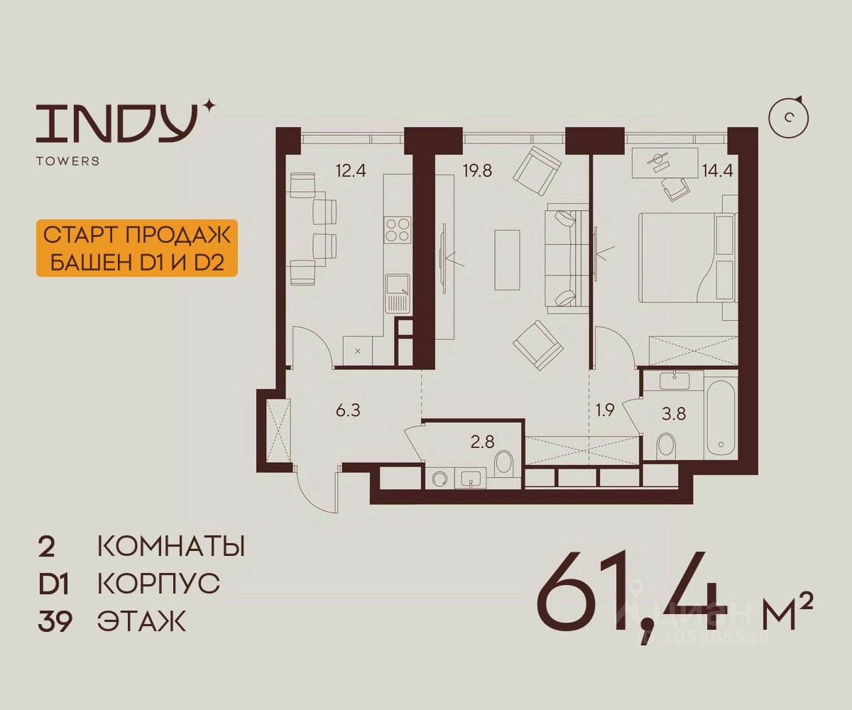 Продается просторная 2-комнатная квартира на 39 этаже жилого комплекса Indy Towers. Срок сдачи: 3 кв. 2029 г.