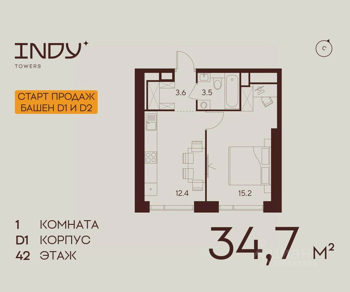 Продается уютная однокомнатная квартира на 42 этаже жилого комплекса Indy Towers. Срок сдачи: 3 кв. 2029 г.