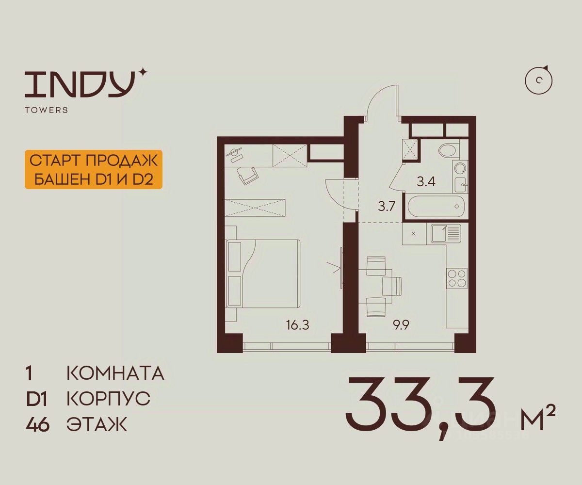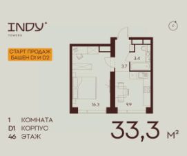 Продается уютная однокомнатная квартира на 46 этаже жилого комплекса Indy Towers. Срок сдачи: 3 кв. 2029 г.