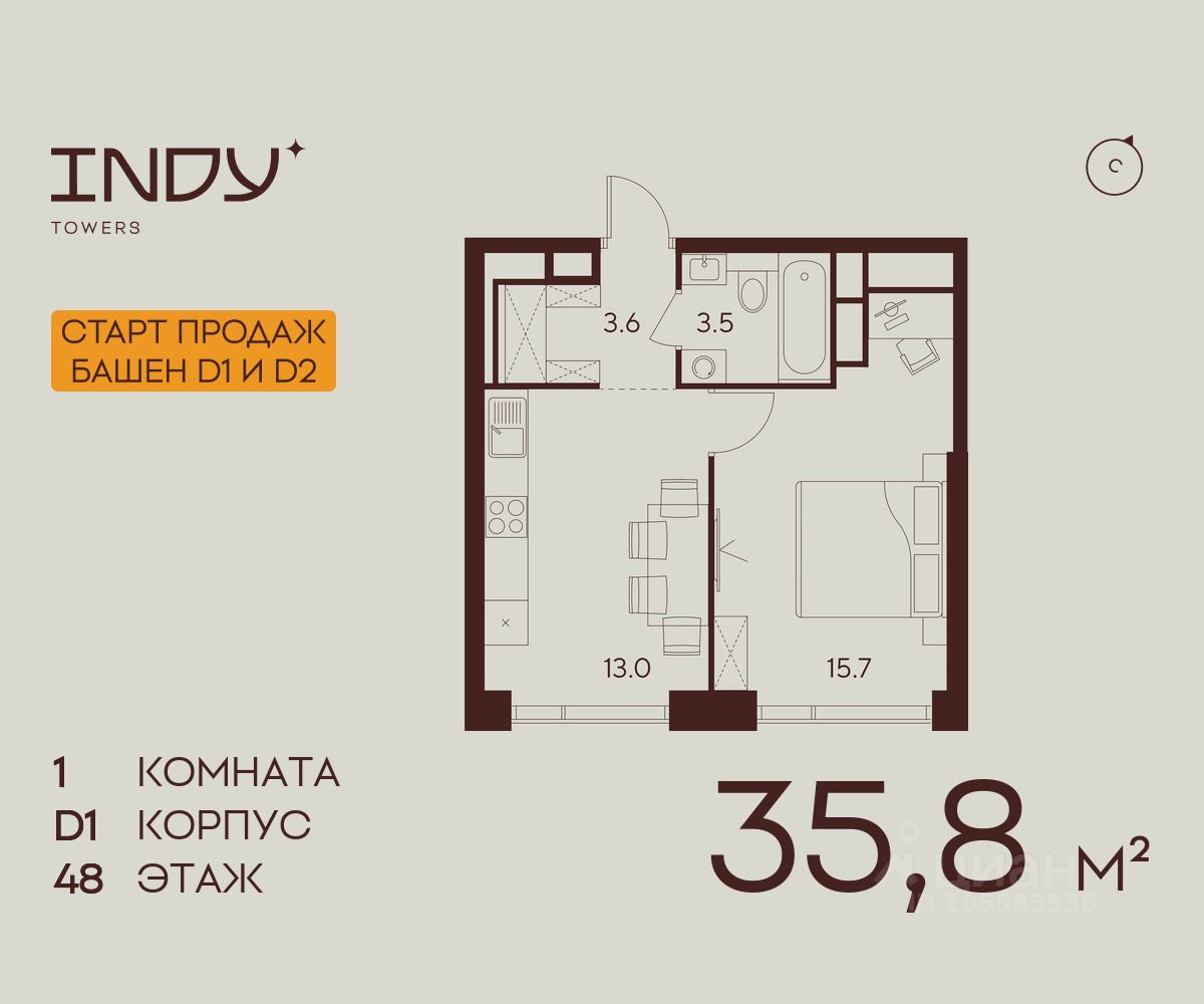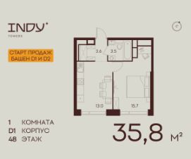 Продается уютная однокомнатная квартира на 48 этаже жилого комплекса Indy Towers. Срок сдачи: 3 кв. 2029 г.
