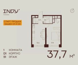 Продается уютная однокомнатная квартира на 51 этаже жилого комплекса Indy Towers. Срок сдачи: 3 кв. 2029 г.