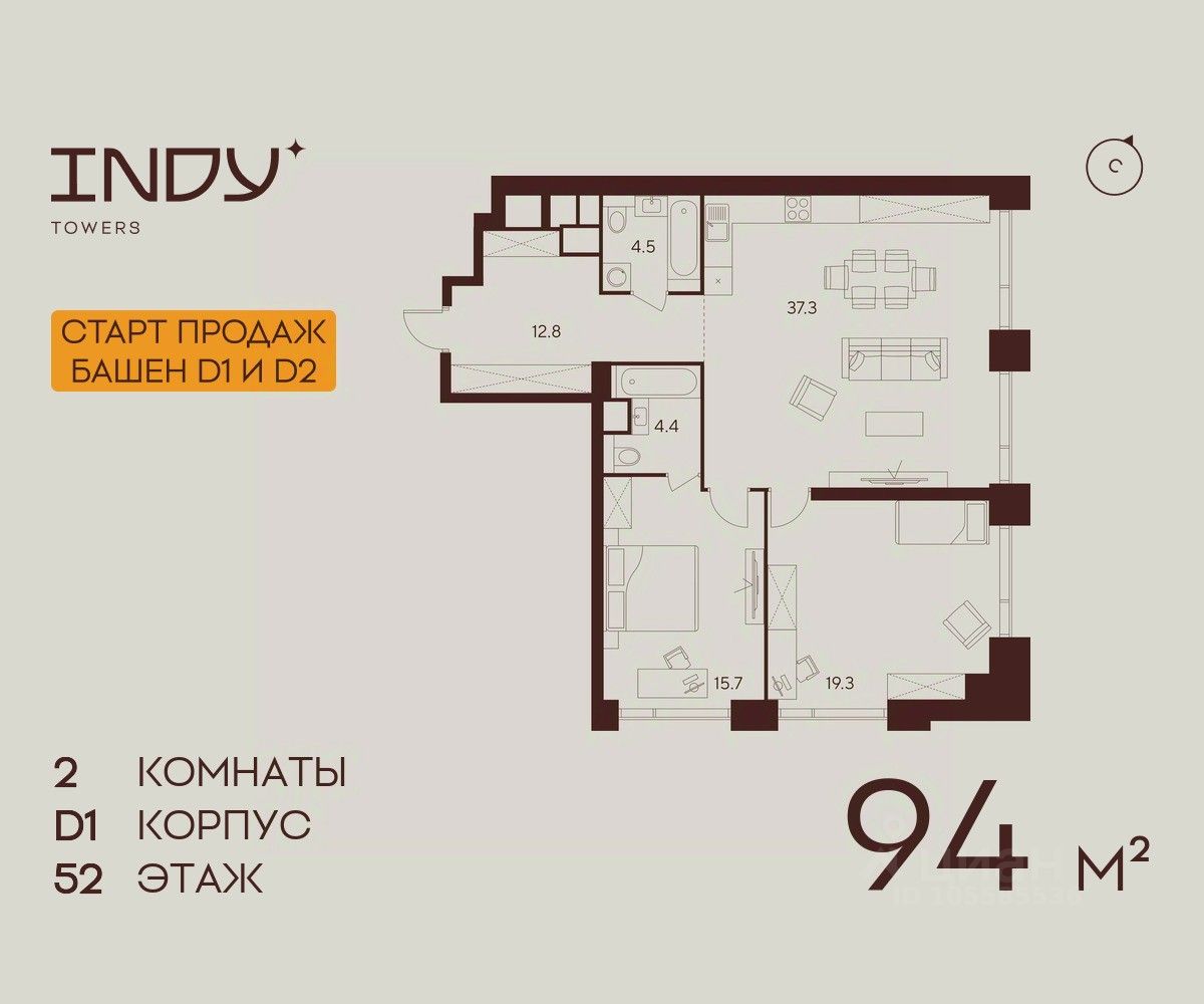 Продается просторная 2-комнатная квартира на 52 этаже жилого комплекса Indy Towers. Срок сдачи: 3 кв. 2029 г.