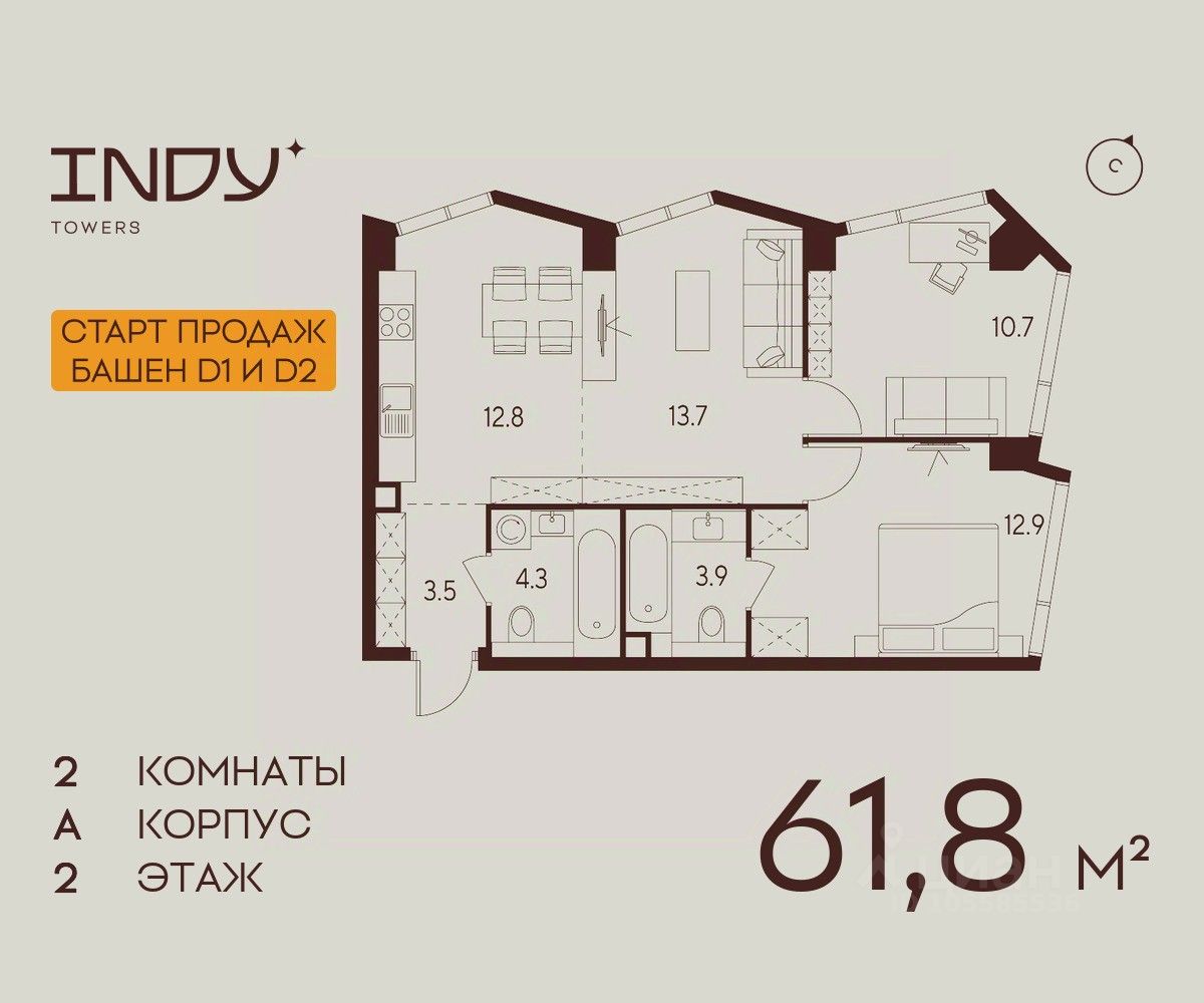 Продается просторная 2-комнатная квартира на 2 этаже жилого комплекса Indy Towers. Вид из окон: во двор. Срок сдачи: 4 кв. 2026 г.