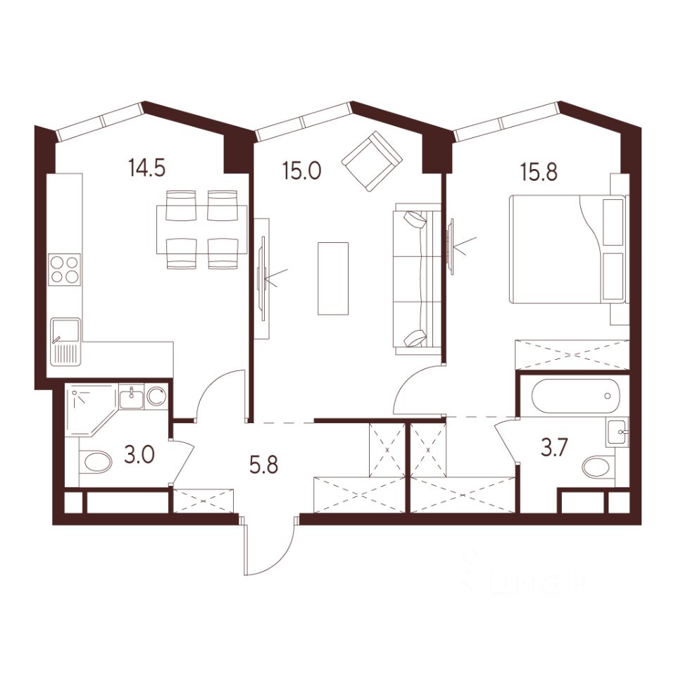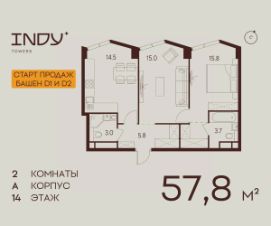 Продается 2-комнатная квартира на 14 этаже жилого комплекса Indy Towers. Вид из окон: во двор. Срок сдачи: 4 кв. 2026 г.