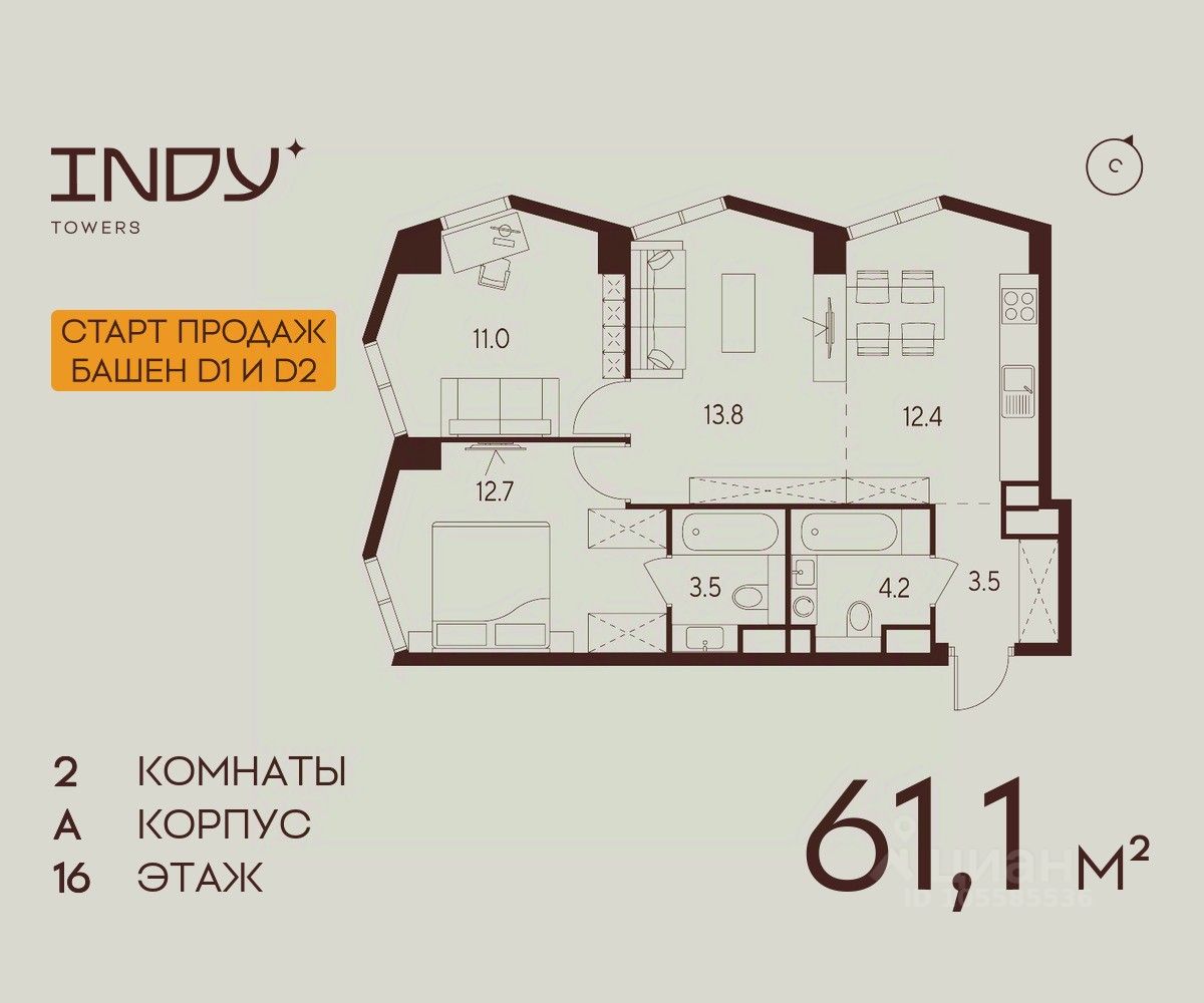 Продается просторная 2-комнатная квартира на 16 этаже жилого комплекса Indy Towers. Вид из окон: во двор и на улицу. Срок сдачи: 4 кв. 2026 г.