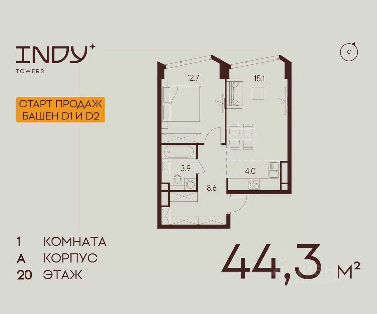 Продается уютная однокомнатная квартира на 20 этаже жилого комплекса Indy Towers. Вид из окон: во двор. Срок сдачи: 4 кв. 2026 г.