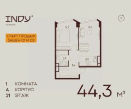 Продается уютная однокомнатная квартира на 21 этаже жилого комплекса Indy Towers. Вид из окон: во двор. Срок сдачи: 4 кв. 2026 г.