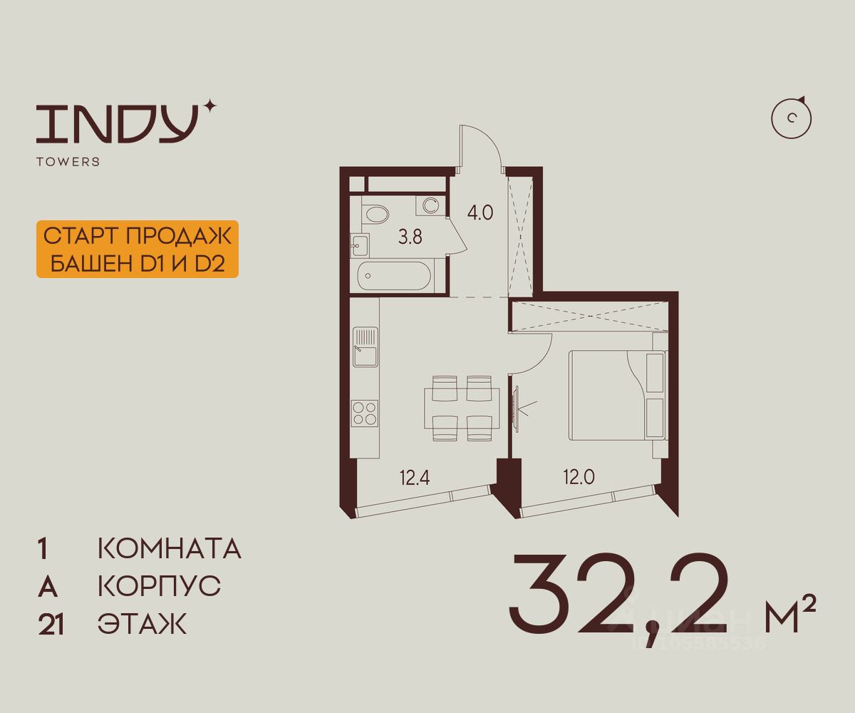 Продается уютная однокомнатная квартира на 21 этаже жилого комплекса Indy Towers. Вид из окон: на улицу. Срок сдачи: 4 кв. 2026 г.