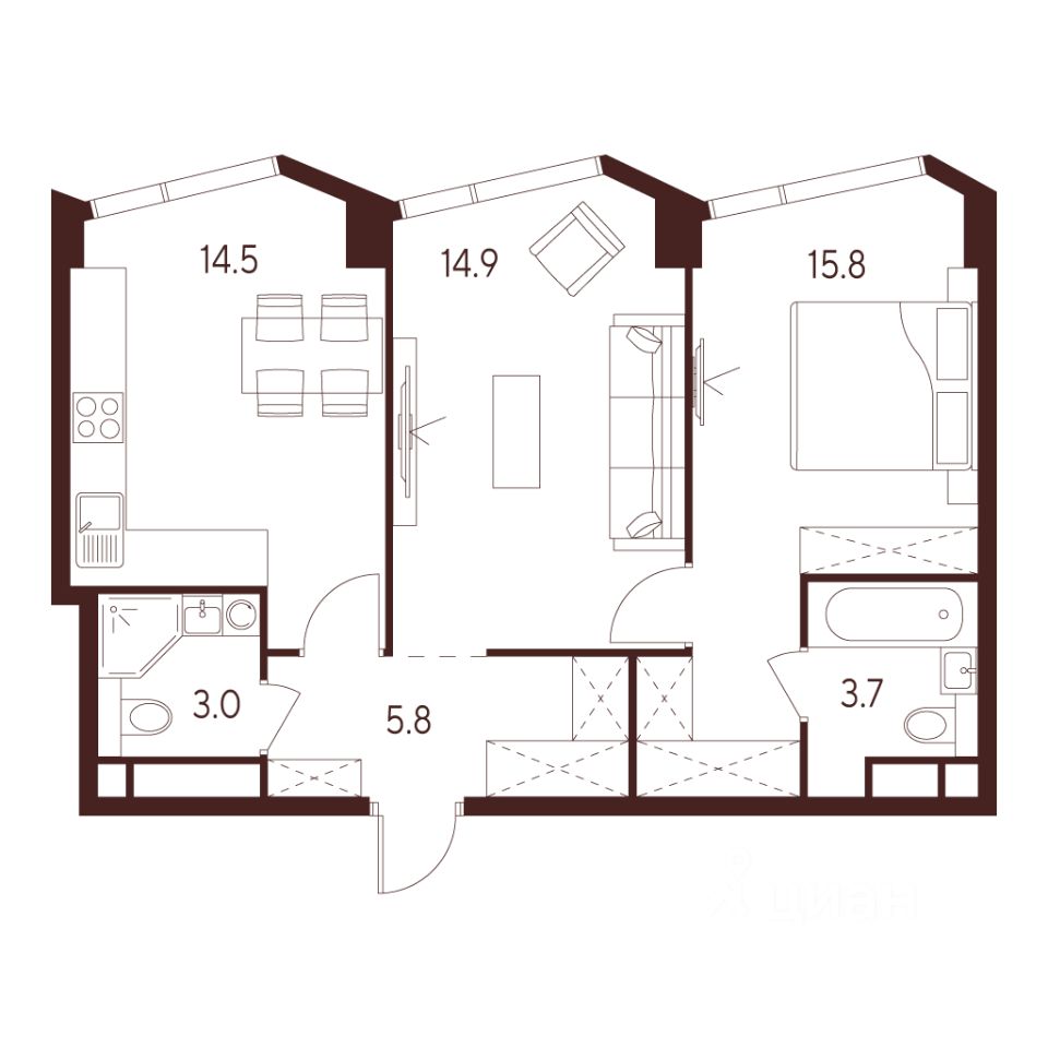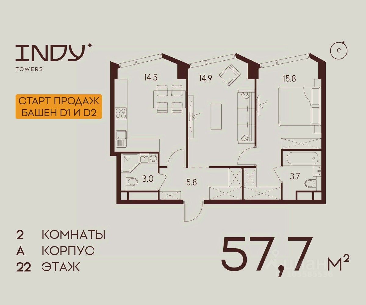 Продается 2-комнатная квартира на 22 этаже жилого комплекса Indy Towers. Вид из окон: во двор. Срок сдачи: 4 кв. 2026 г.