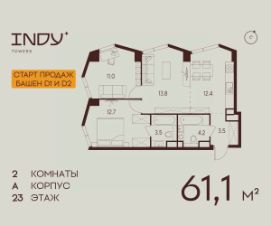 Продается просторная 2-комнатная квартира на 23 этаже жилого комплекса Indy Towers. Вид из окон: во двор и на улицу. Срок сдачи: 4 кв. 2026 г.