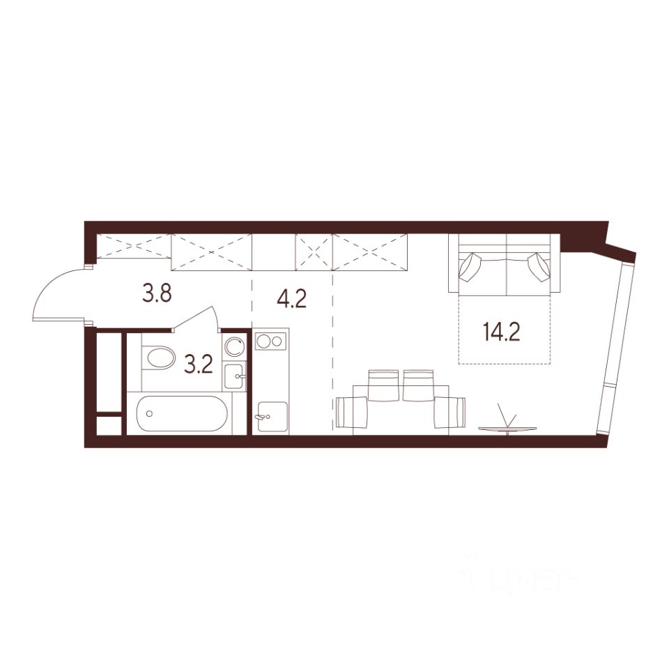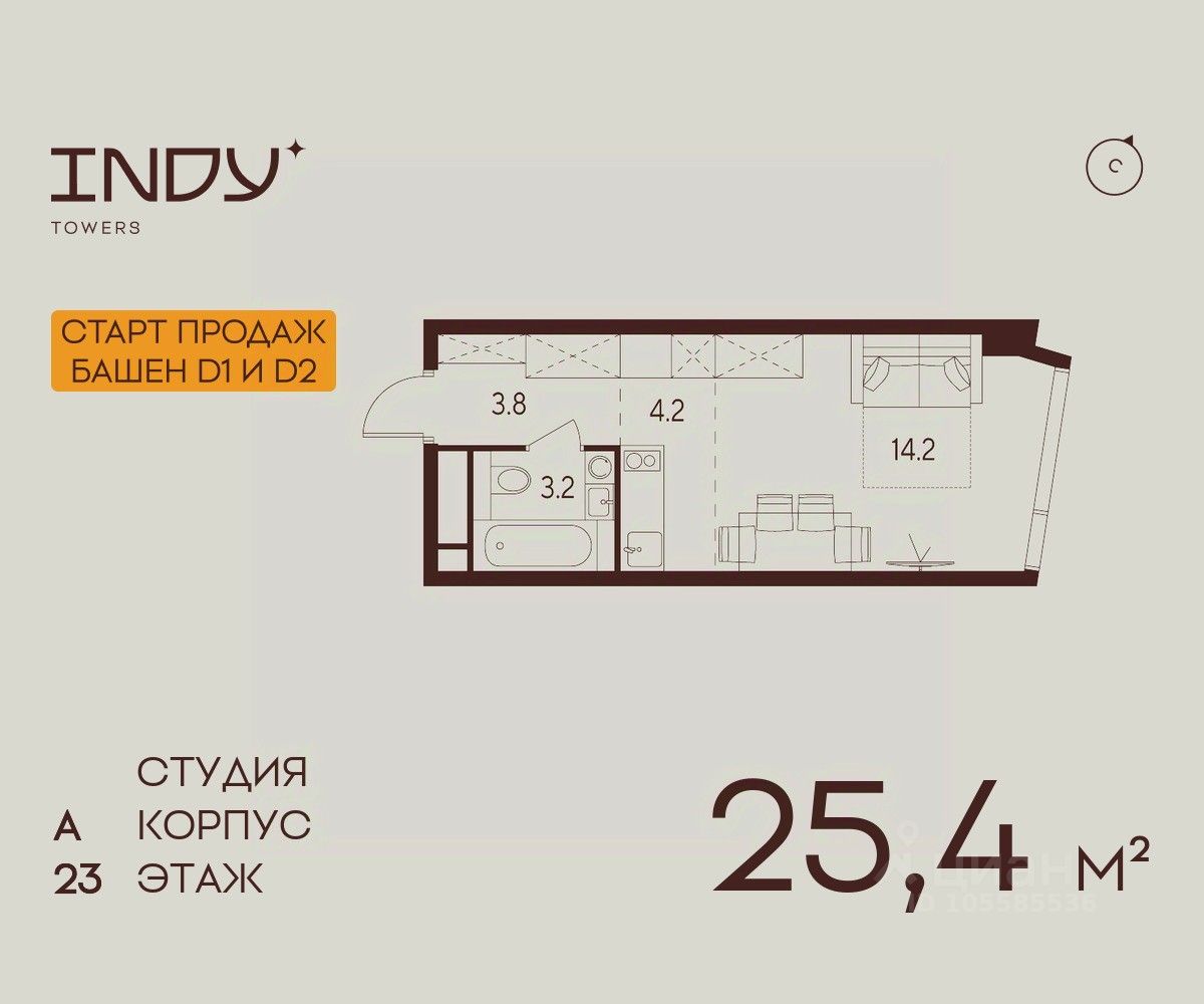 Продается просторная студия на 23 этаже жилого комплекса Indy Towers. Вид из окон: во двор. Срок сдачи: 4 кв. 2026 г.