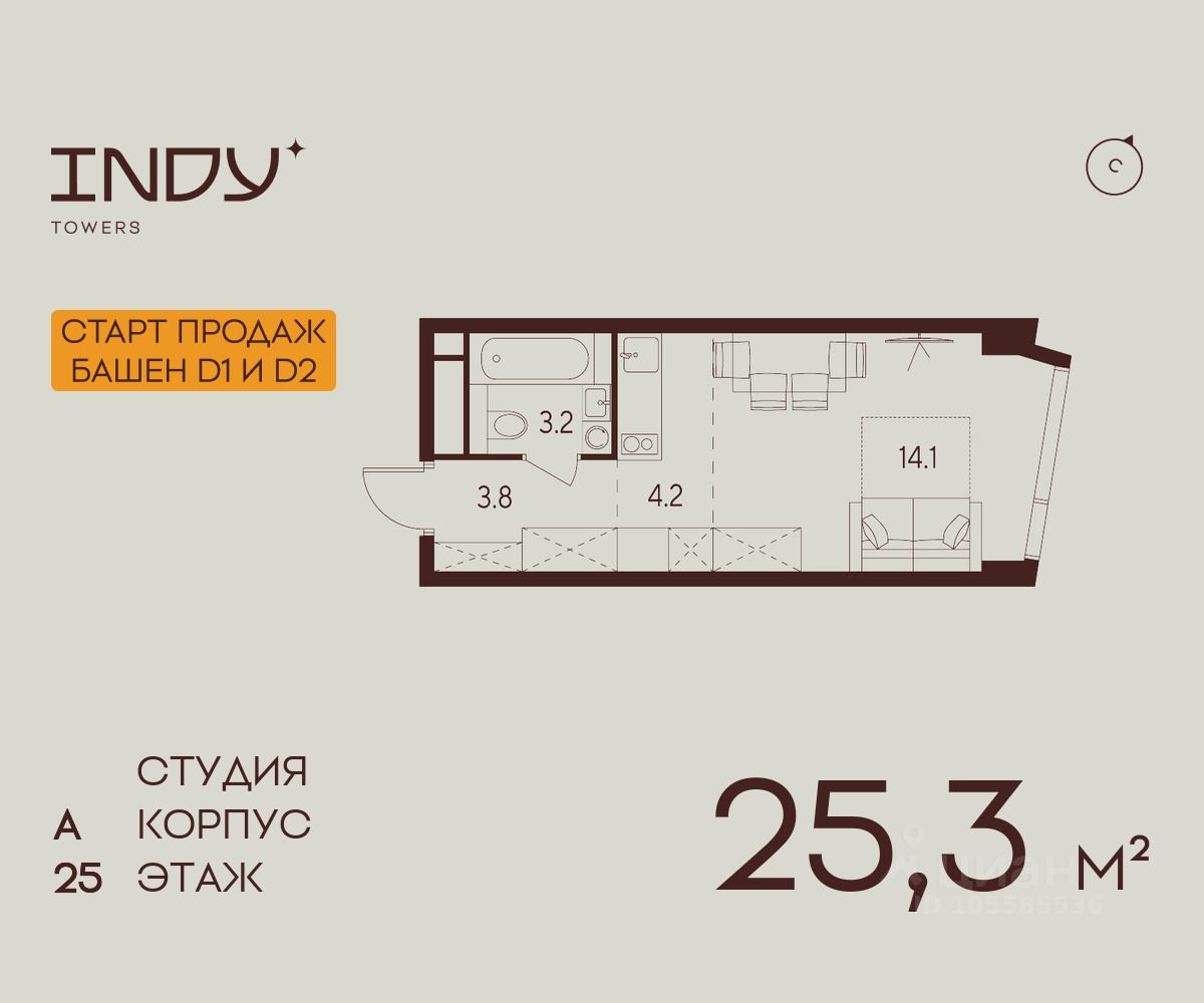 Продается просторная студия на 25 этаже жилого комплекса Indy Towers. Вид из окон: во двор. Срок сдачи: 4 кв. 2026 г.