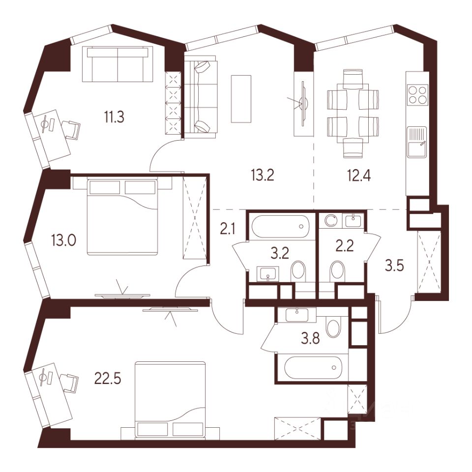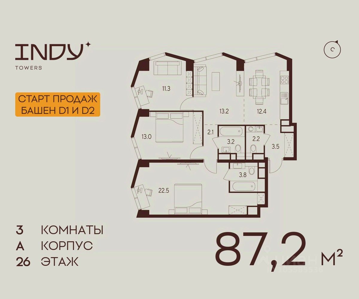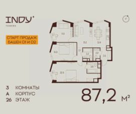 Продается просторная 3-комнатная квартира на 26 этаже жилого комплекса Indy Towers. Вид из окон: во двор и на улицу. Срок сдачи: 4 кв. 2026 г.