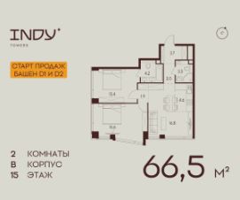 Продается просторная 2-комнатная квартира на 15 этаже жилого комплекса Indy Towers. Вид из окон: во двор и на улицу. Срок сдачи: 4 кв. 2026 г.