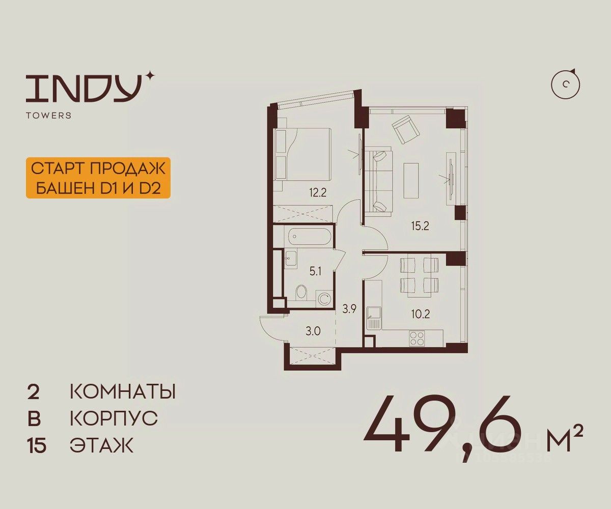Продается 2-комнатная квартира на 15 этаже жилого комплекса Indy Towers. Вид из окон: во двор и на улицу. Срок сдачи: 4 кв. 2026 г.