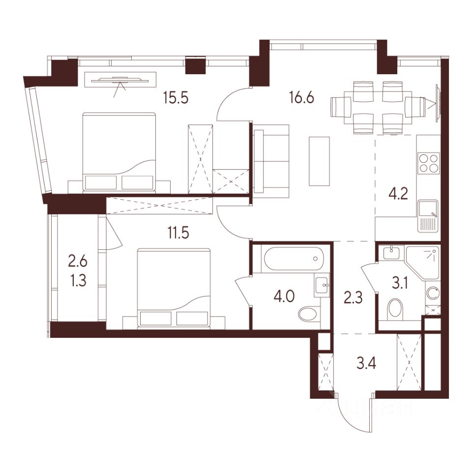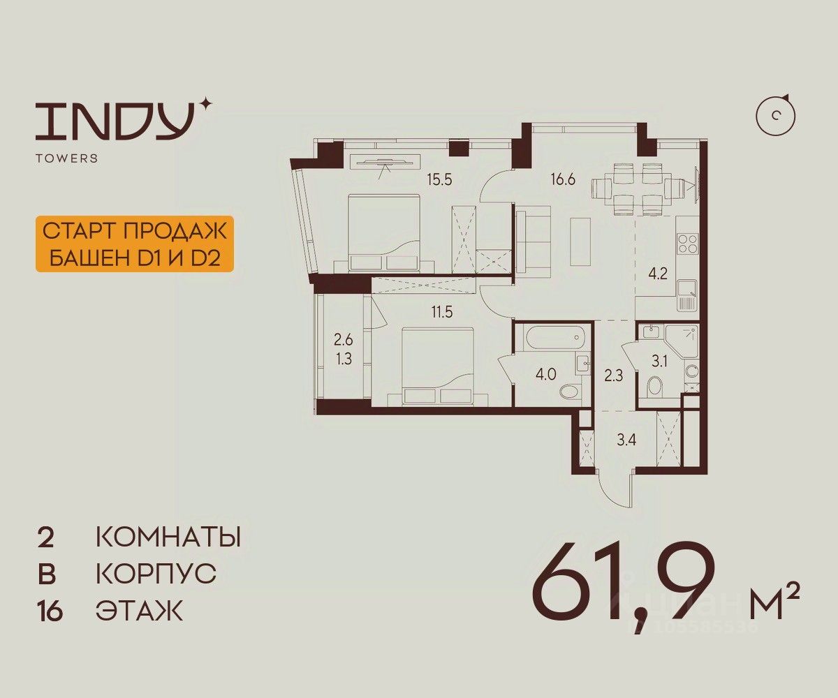 Продается просторная 2-комнатная квартира на 16 этаже жилого комплекса Indy Towers. Вид из окон: на улицу. Срок сдачи: 4 кв. 2026 г.
