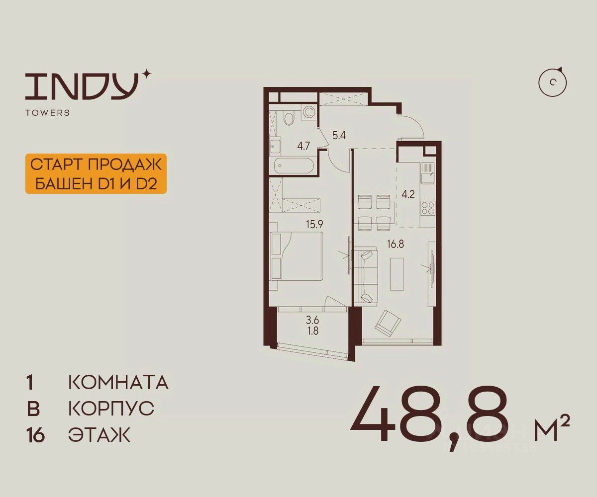 Продается уютная однокомнатная квартира на 16 этаже жилого комплекса Indy Towers. Вид из окон: во двор. Срок сдачи: 4 кв. 2026 г.