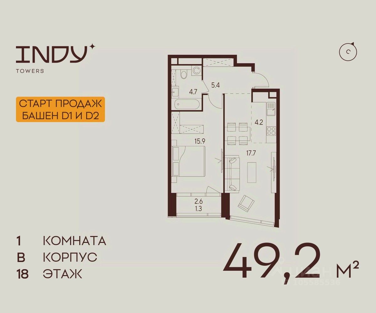 Продается уютная однокомнатная квартира на 18 этаже жилого комплекса Indy Towers. Вид из окон: во двор. Срок сдачи: 4 кв. 2026 г.