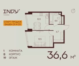 Продается уютная однокомнатная квартира на 19 этаже жилого комплекса Indy Towers. Вид из окон: на улицу. Срок сдачи: 4 кв. 2026 г.