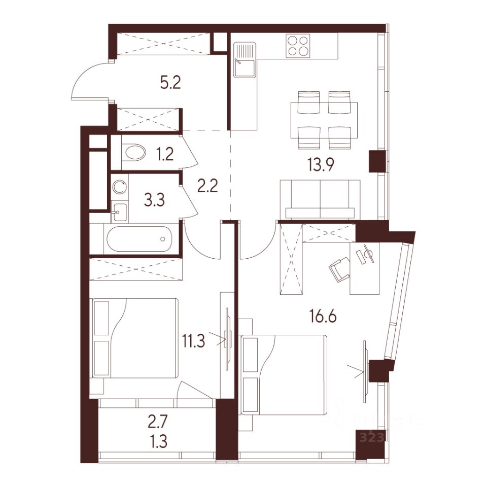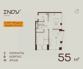 Продается 2-комнатная квартира на 19 этаже жилого комплекса Indy Towers. Вид из окон: во двор. Срок сдачи: 4 кв. 2026 г.