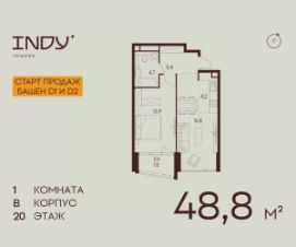 Продается уютная однокомнатная квартира на 20 этаже жилого комплекса Indy Towers. Вид из окон: во двор. Срок сдачи: 4 кв. 2026 г.