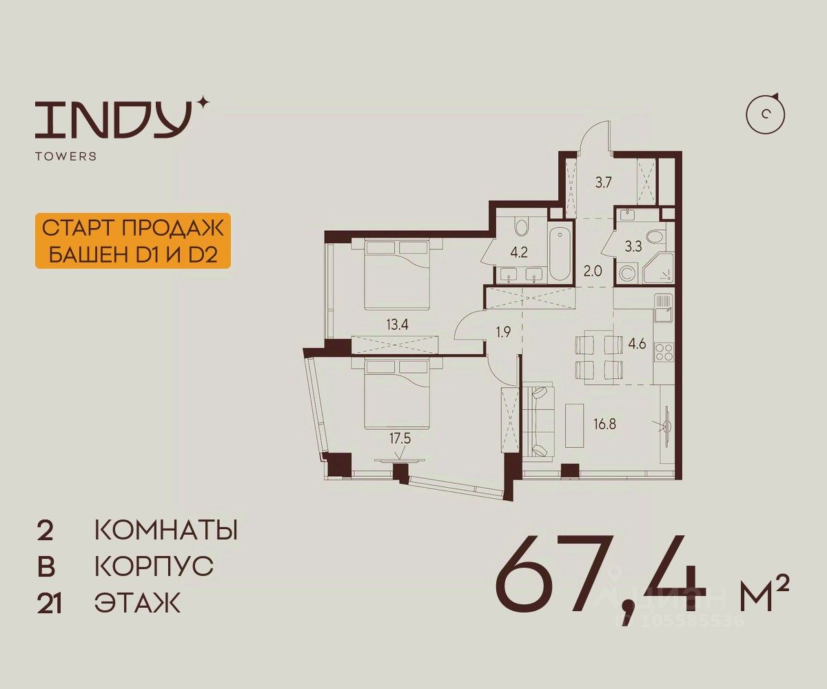 Продажа от застройщика. Продается просторная 2-комнатная квартира на 21 этаже жилого комплекса Indy Towers. Вид из окон: во двор и на улицу. Срок сдачи: 4 кв. 2026 г. Расположение: Комплекс расположен в Хорошевском районе Москвы, на улице Куусенина, в окружении почти 150 гектаров парков для прогулок и активного отдыха. Помимо этого, рядом с комплексом есть: - Детская международная академия тенниса - Ледовый спортивный комплекс ЦСКА - Футбольный стадион "ВЭБ-Арена" - Крупнейший в Европе торовый центр "Авиапарк" - Богатый выбор государственных и частных школ - 8 парков, окружающих комплекс Транспортная доступность: - 3 минут до метро Зорге - 2 минуты пешком до парка Березовая роща - 10 минут на машине до ТТК - 8 минут на машине до ТРЦ Авиапарк Внутренняя инфраструктура Indy Towers: - Кафе и продуктовые магазины - Тайский SPA - Фитнес зал - Комьюнити-зона - Детский клуб Аквилон KIDS - Детский сад Преимущества: - Технология энергоэффективности Termo-S, снижающая теплопотерю домов и позволяющую экономить на электроснабжении - Soundstop - технология дополнительной шумоизоляции на 39 дБ в квартирах с WhiteBox и чистовой отделкой - Система умного дома inHome 3.0 позволит контролировать коммунальные расходы, оплачивать счета и пользоваться услугами, не выходя из умного дома