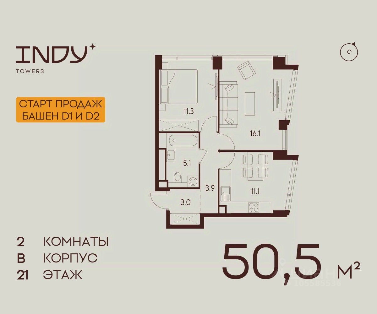 Продается 2-комнатная квартира на 21 этаже жилого комплекса Indy Towers. Вид из окон: во двор и на улицу. Срок сдачи: 4 кв. 2026 г.
