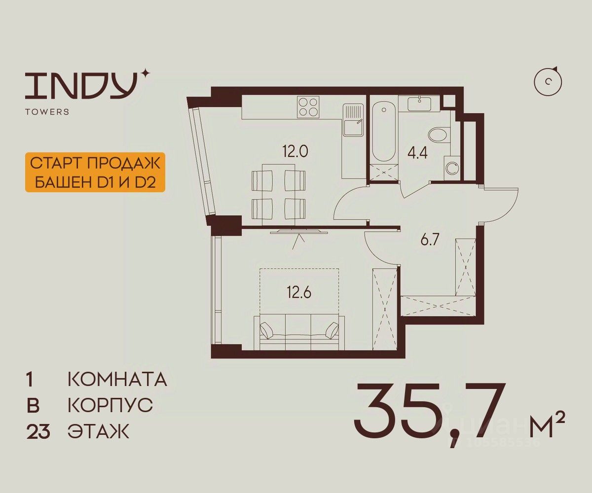 Продается уютная однокомнатная квартира на 23 этаже жилого комплекса Indy Towers. Вид из окон: на улицу. Срок сдачи: 4 кв. 2026 г.