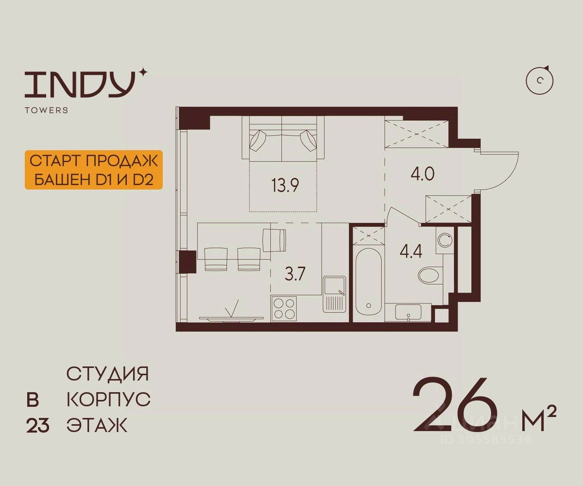 Продажа от застройщика. Продается просторная студия на 23 этаже жилого комплекса Indy Towers. Вид из окон: на улицу. Срок сдачи: 4 кв. 2026 г. Отделка: Квартиры продаются с отделкой WhiteBox. - Вам не придется заниматься черновыми работами. - Возможность реализовать любой дизайн-проект. Расположение: Комплекс расположен в Хорошевском районе Москвы, на улице Куусенина, в окружении почти 150 гектаров парков для прогулок и активного отдыха. Помимо этого, рядом с комплексом есть: - Детская международная академия тенниса - Ледовый спортивный комплекс ЦСКА - Футбольный стадион "ВЭБ-Арена" - Крупнейший в Европе торовый центр "Авиапарк" - Богатый выбор государственных и частных школ - 8 парков, окружающих комплекс Транспортная доступность: - 3 минут до метро Зорге - 2 минуты пешком до парка Березовая роща - 10 минут на машине до ТТК - 8 минут на машине до ТРЦ Авиапарк Внутренняя инфраструктура Indy Towers: - Кафе и продуктовые магазины - Тайский SPA - Фитнес зал - Комьюнити-зона - Детский клуб Аквилон KIDS - Детский сад Преимущества: - Технология энергоэффективности Termo-S, снижающая теплопотерю домов и позволяющую экономить на электроснабжении - Soundstop - технология дополнительной шумоизоляции на 39 дБ в квартирах с WhiteBox и чистовой отделкой - Система умного дома inHome 3.0 позволит контролировать коммунальные расходы, оплачивать счета и пользоваться услугами, не выходя из умного дома