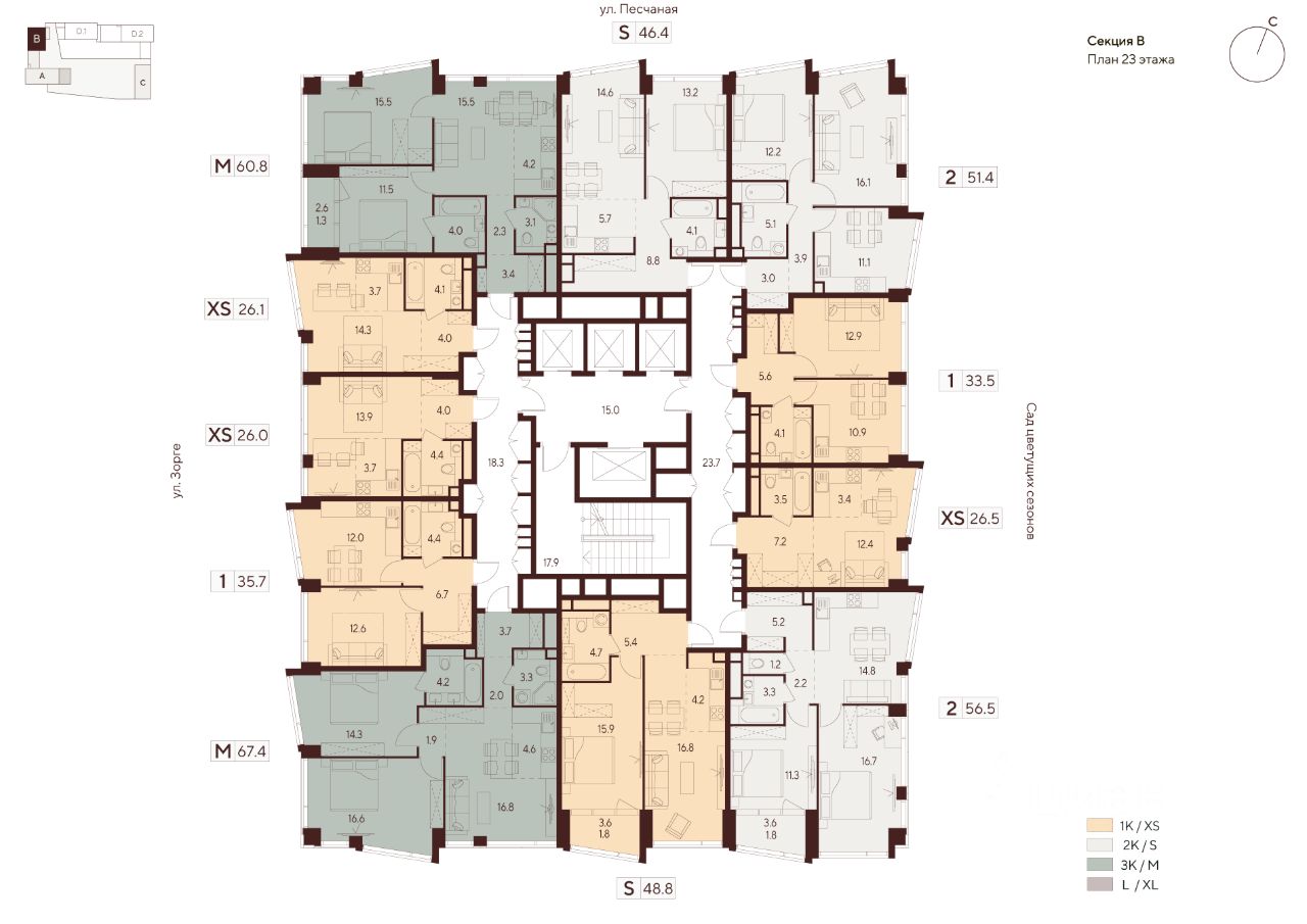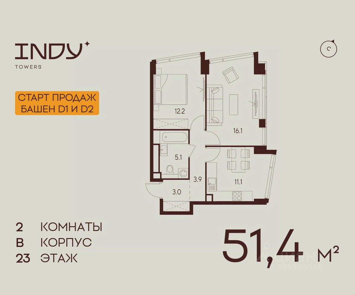 Продается 2-комнатная квартира на 23 этаже жилого комплекса Indy Towers. Вид из окон: во двор и на улицу. Срок сдачи: 4 кв. 2026 г.