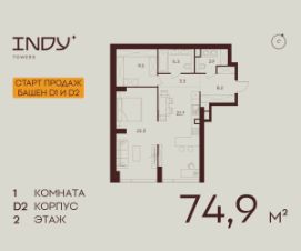 Продается уютная однокомнатная квартира на 2 этаже жилого комплекса Indy Towers. Срок сдачи: 3 кв. 2029 г.
