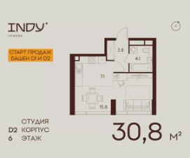 Продается просторная студия на 6 этаже жилого комплекса Indy Towers. Срок сдачи: 3 кв. 2029 г.