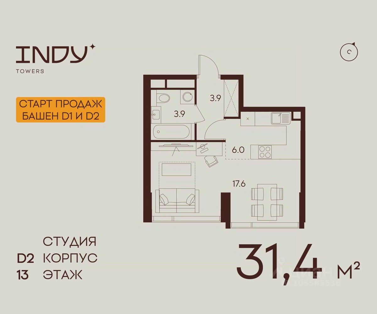 Продается просторная студия на 13 этаже жилого комплекса Indy Towers. Срок сдачи: 3 кв. 2029 г.