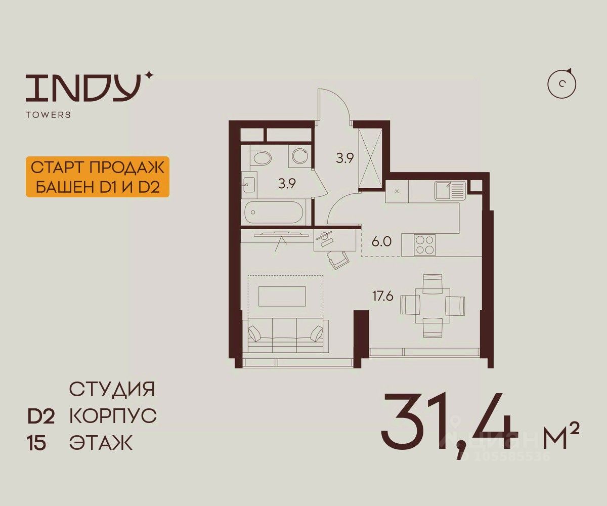 Продается просторная студия на 15 этаже жилого комплекса Indy Towers. Срок сдачи: 3 кв. 2029 г.