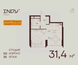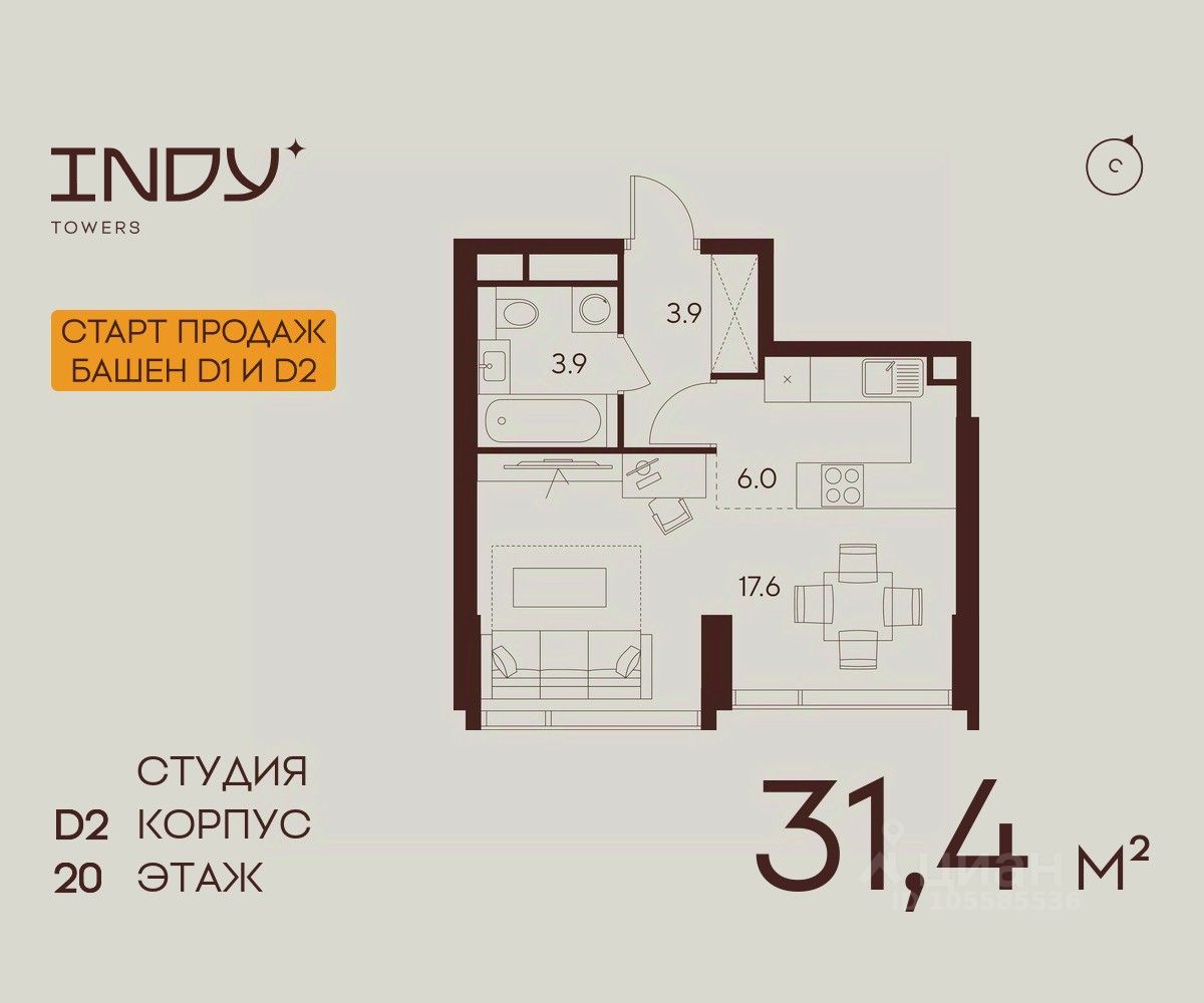 Продается просторная студия на 20 этаже жилого комплекса Indy Towers. Срок сдачи: 3 кв. 2029 г.