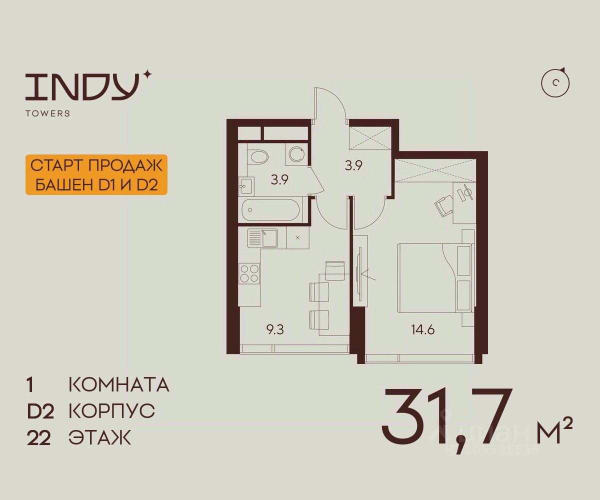 Продается уютная однокомнатная квартира на 22 этаже жилого комплекса Indy Towers. Срок сдачи: 3 кв. 2029 г.