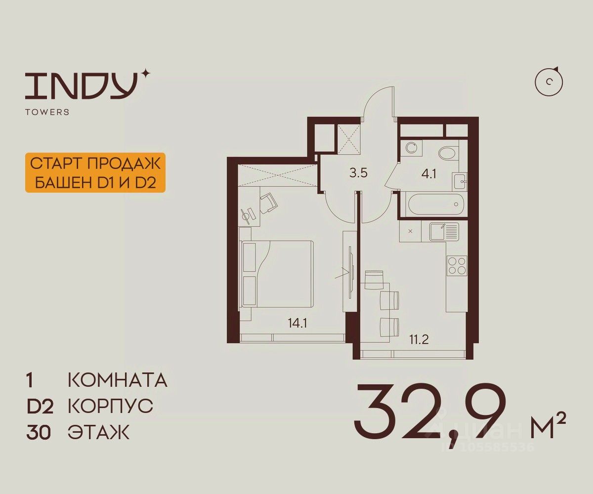 Продается уютная однокомнатная квартира на 30 этаже жилого комплекса Indy Towers. Срок сдачи: 3 кв. 2029 г.
