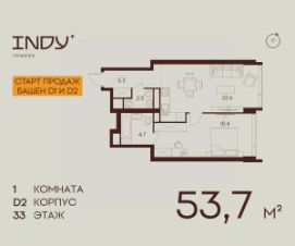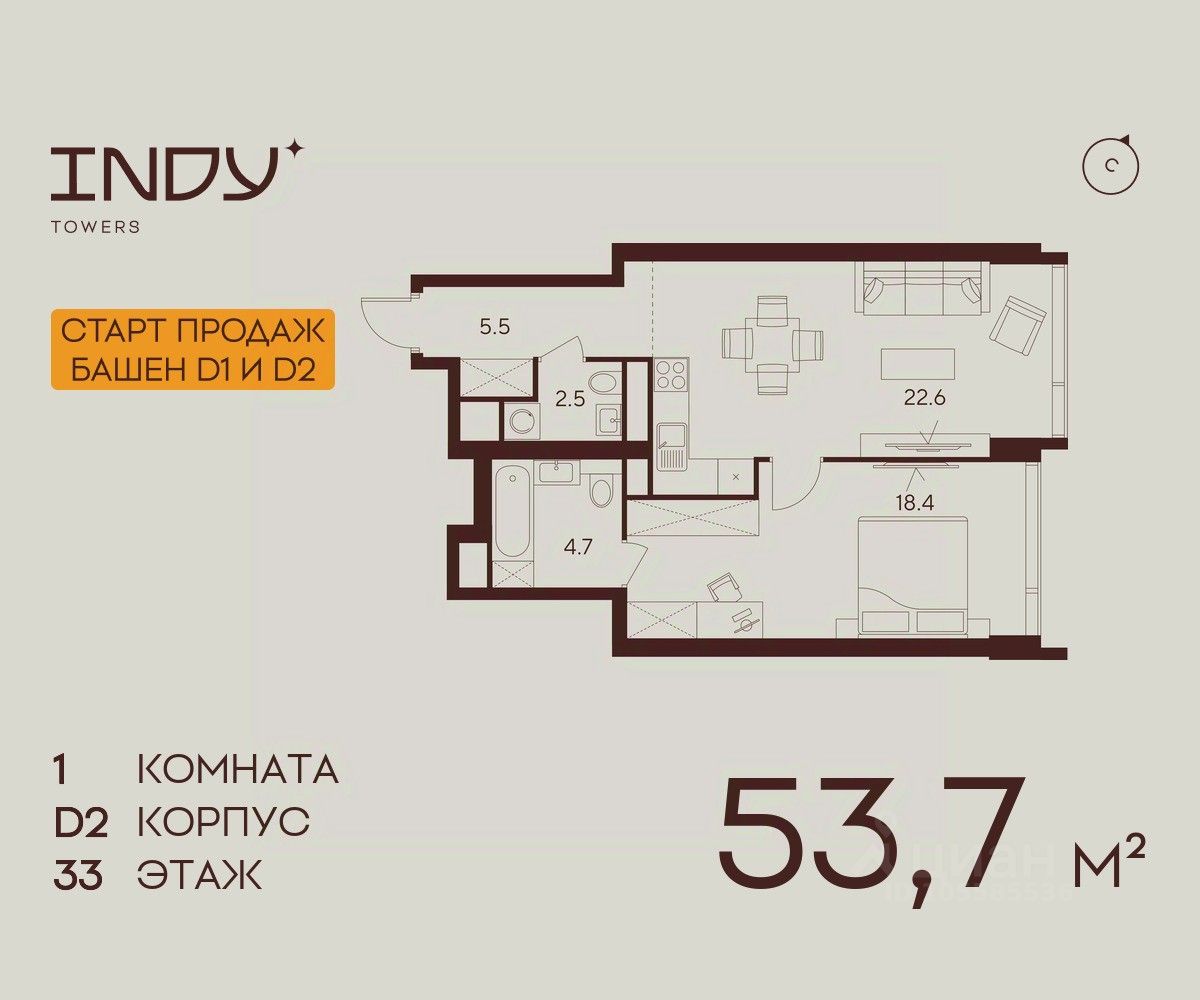 Продается уютная однокомнатная квартира на 33 этаже жилого комплекса Indy Towers. Срок сдачи: 3 кв. 2029 г.