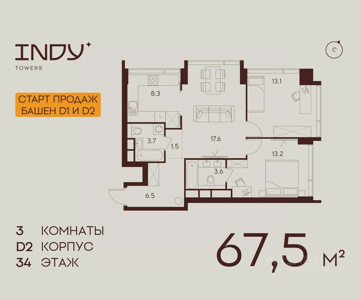 Продается просторная 3-комнатная квартира на 34 этаже жилого комплекса Indy Towers. Срок сдачи: 3 кв. 2029 г.