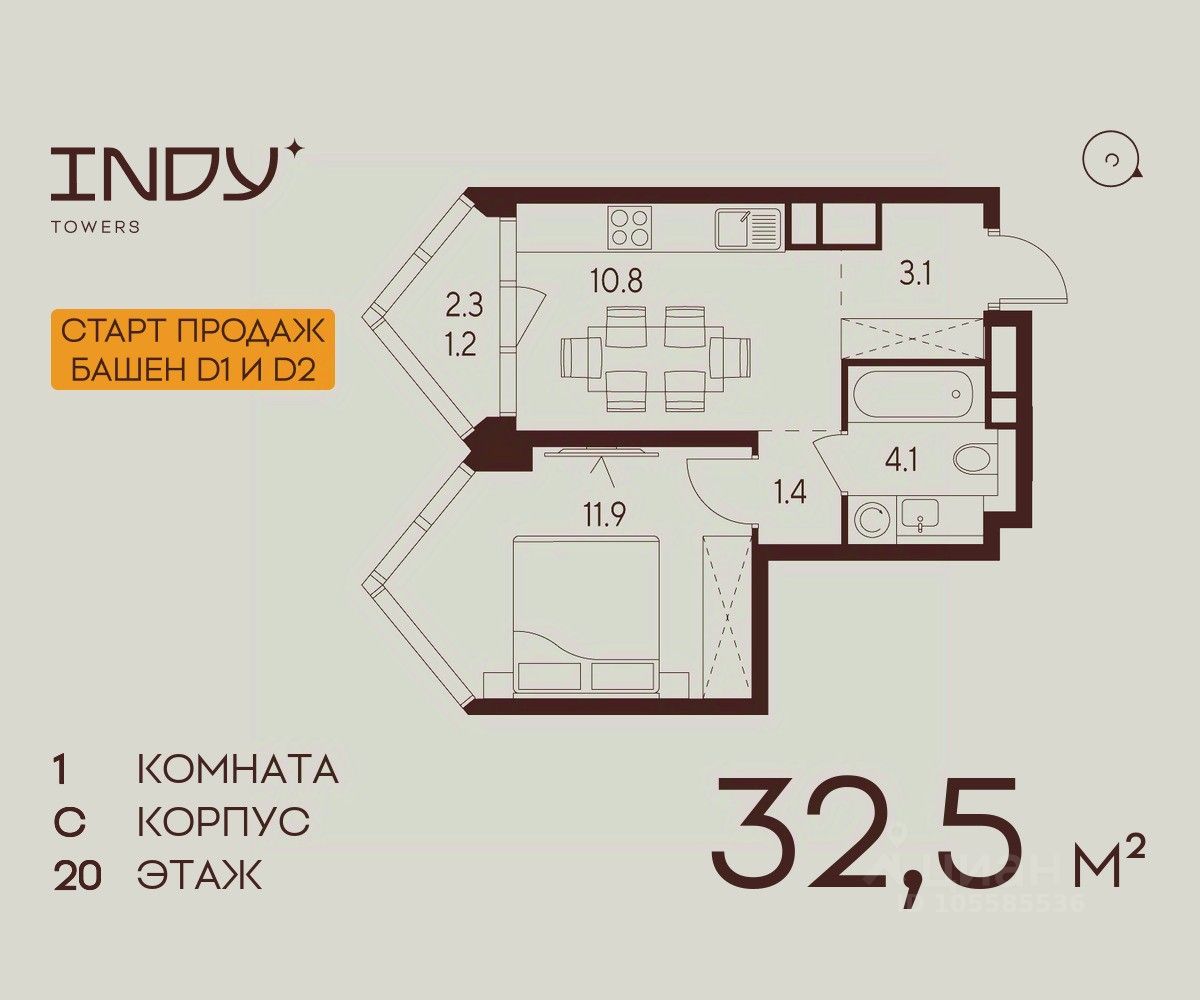 Продается уютная однокомнатная квартира на 20 этаже жилого комплекса Indy Towers. Вид из окон: во двор. Срок сдачи: 4 кв. 2026 г.