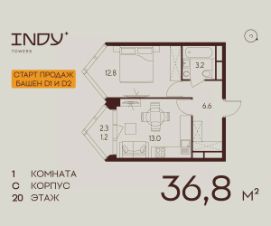 Продается уютная однокомнатная квартира на 20 этаже жилого комплекса Indy Towers. Вид из окон: во двор. Срок сдачи: 4 кв. 2026 г.
